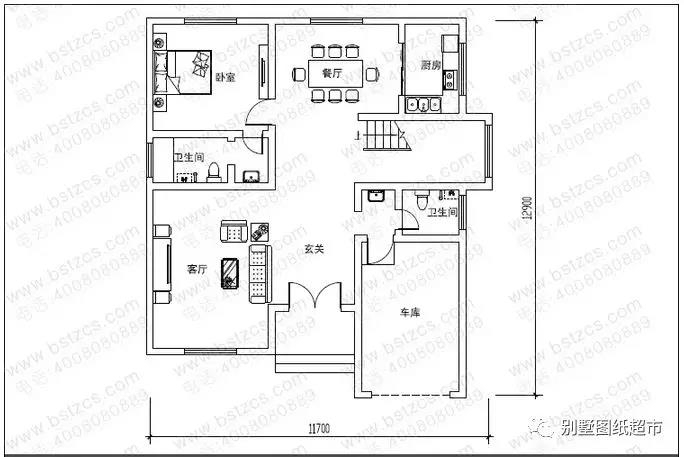 一 層:客廳、臥室(附衛生間)、廚房、餐廳、衛生間、車庫