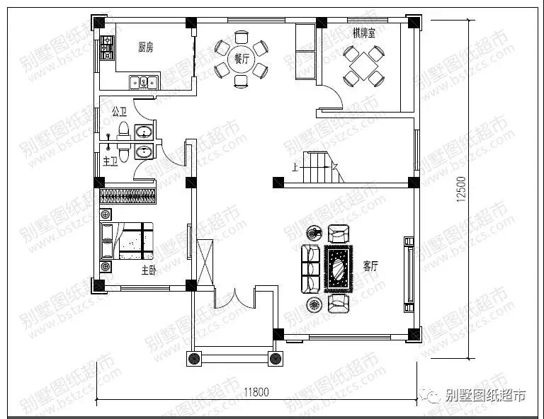 一 層:客廳(中空)、臥室(附衛生間)、臥室、棋牌室、廚房、餐廳、衛生間