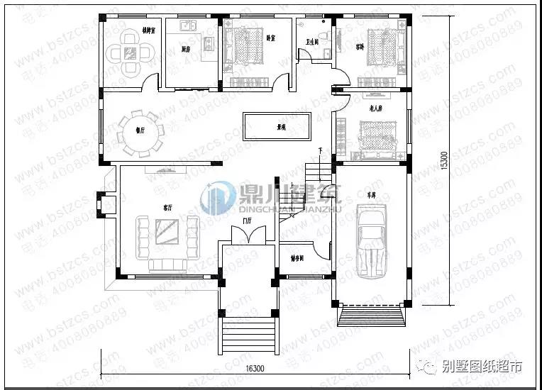 一 層:客廳(中空)、臥室、棋牌室、廚房、餐廳、衛(wèi)生間、車庫(kù)