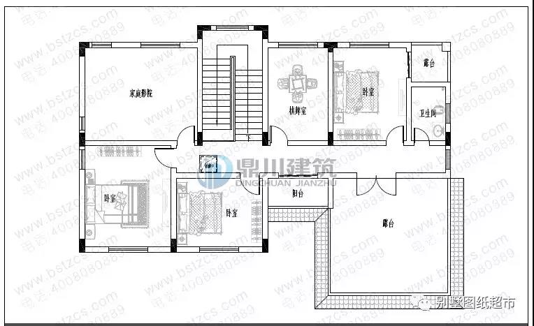 三 層:家庭影院、棋牌室、臥室(附露臺(tái))、2臥室、衛(wèi)生間、陽(yáng)臺(tái)、露臺(tái)