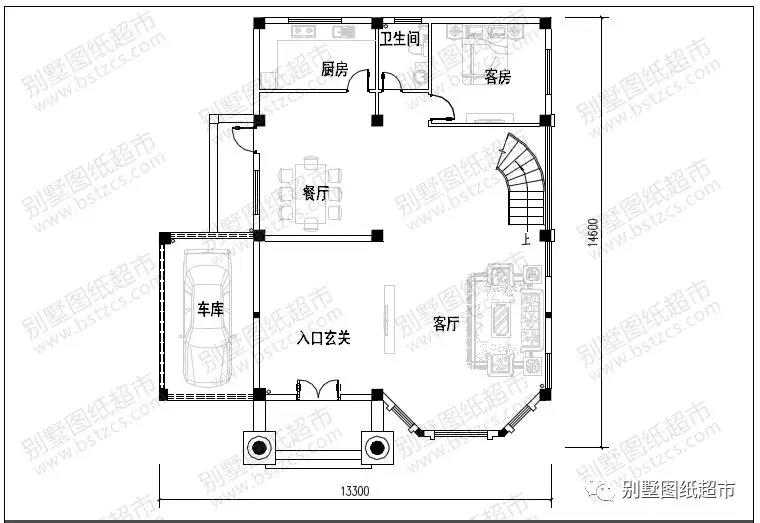一 層:入口玄關、客廳、餐廳、廚房、客房、衛(wèi)生間、車庫
