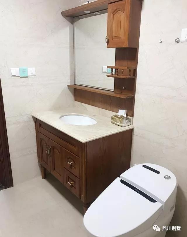衛生間洗手臺也是延續著我們中式風格,馬桶是智能馬桶~