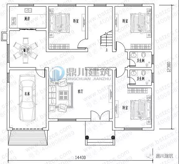 一 層: 客廳、臥室(附衛生間)、2臥室、廚房、餐廳、衛生間、車庫
