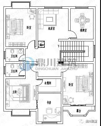 二 層: 小客廳、臥室(附衛(wèi)生間)、2臥室、書房(或臥室)、衛(wèi)生間、陽臺