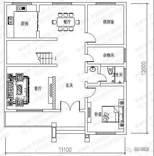 一 層: 客廳、臥室、棋牌室(或臥室)、廚房、餐廳、雜物間、衛(wèi)生間