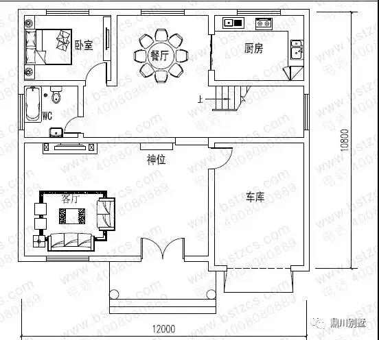 一 層: 客廳、臥室、廚房、餐廳、衛生間、車庫