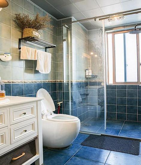 藍色磚:藍色是最近幾年比較流行的顏色,大面積鋪設會給人一種溫潤舒適的感覺。可以從上到下,做漸變效果會更加好看。而且藍色磚屬于亮麗柔和的顏色,如果衛生間采光不夠好,可以達到提亮的效果,用起來還很耐臟。