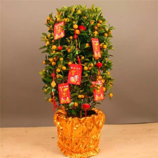 吉祥招財之金桔:桔為吉,金為財,金桔也就有了吉祥招財的含意。金桔樹可以擺在家中,也可以作為賀禮,在拜年用的果籃里放上一些金桔,是很好的祝福方式。需要注意的是,選購盆桔時一定要挑選果滿(因果疏有“兇多吉小”之意)、果色要紅潤、枝葉要碧綠不要有黃葉。