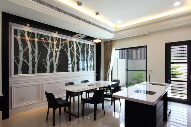 將廚房與用餐區結合在一塊,因此整體空間非常寬敞。選擇白色的流理臺搭配黑色的櫥柜,這間別墅的廚房非常有簡約現代風的味道。