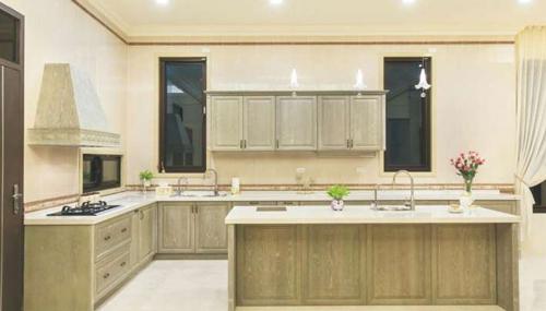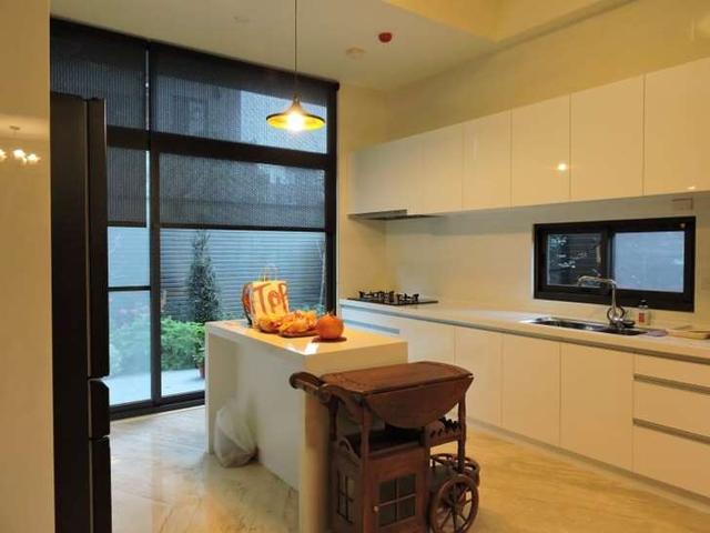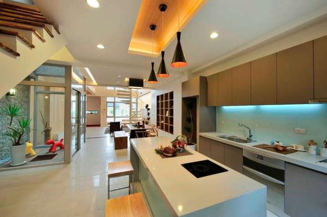 米色系的櫥柜比較有霧面感,與光亮的中島形成對比。對于動線較長型的別墅來說,是善用空間的好設計。