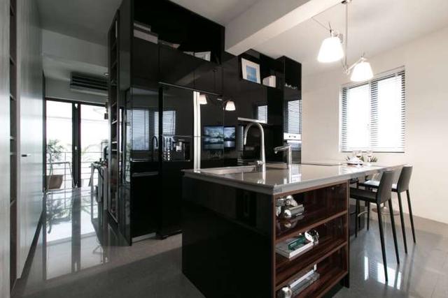 喜歡低調奢華的風格,可以選擇全黑色系的家電與櫥柜,由于廚房墻面是白色的,因此空間一點也不會顯得有壓迫感。中島廚房除了機能性高,還有收納空間,非常實用。