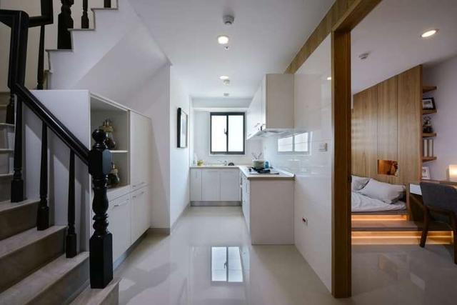 位在角落的 L 型廚房超省空間,而且造型與色系都很極簡,讓畫面更整潔。