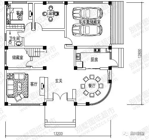 一 層:客廳、麻將室、客房、廚房、餐廳、衛生間、儲藏室、車庫