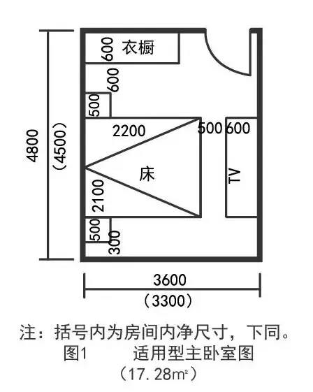 1、主臥室的最低開間中到中尺寸是3.6m(凈3.3m) ,最低進深中到中尺寸是4.8m(凈4.5m),這是保證家具擺放和人的活動最低適用要求的尺寸(圖1)
