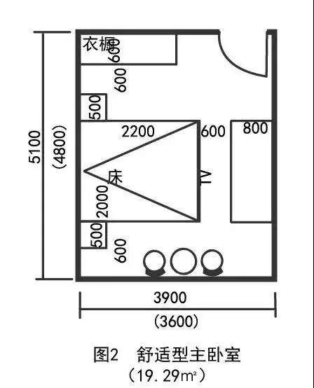 2、主臥室的“舒適”開間中到中尺寸是3.9m(凈3.6m) ,進深中到中尺寸是5.1m(凈4.8m),是家具擺放和人的活動是比較方便舒適的(圖2)