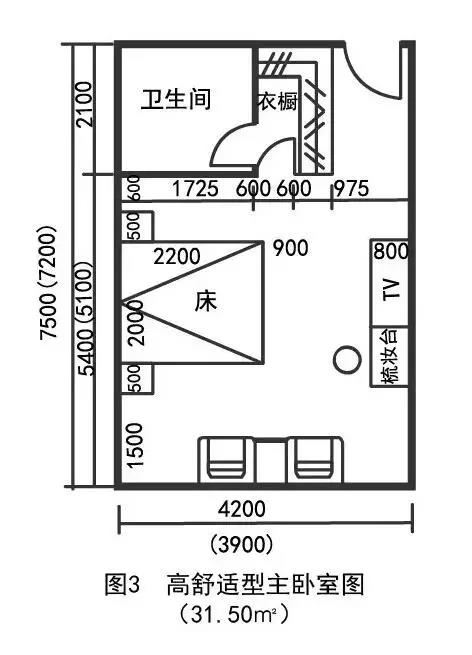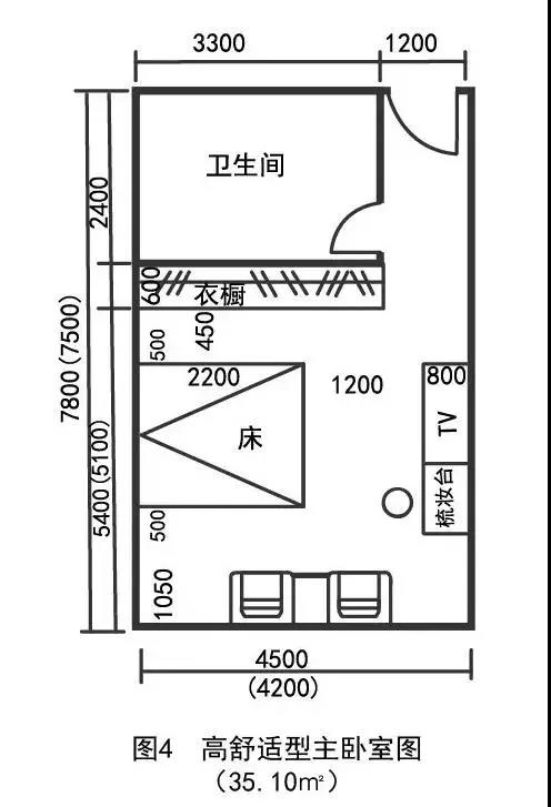 3、主臥室的“高舒適”開間中到中尺寸是4.2m(凈3.9m) ,進深中到中尺寸是7.5m(凈 7.2m),這時家具擺放和人的活動會更加方便舒適;不僅如此,到了這一級,主臥室就應該配有主衛生間和進入式衣帽間( 圖3),或不設進入式衣帽間,把衛生間做大,使洗浴更加舒適(圖4)