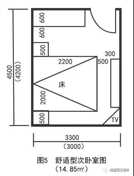 次臥最低“適用”開間中到中尺寸是3.3m(凈3.0m) ,進深中到中尺寸是4.5m(凈4.2m),如圖5。這里講的是最低“適用”要求,因為小于這個尺寸就會給家具布置和人的活動帶來不便,如果小于這個尺寸,應該設計為書房、兒童房等。