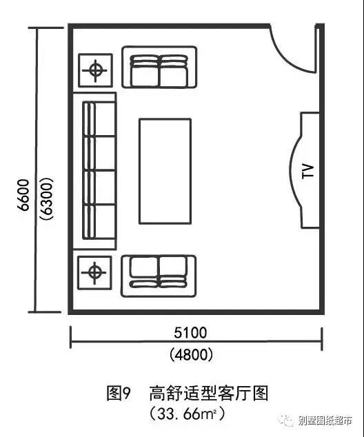 3、客廳的“高舒適”尺寸要求,大致為開間5.1m,進深6.6m,建筑面積33.66㎡,如圖9 所示。這種尺寸無論在開間方向或進深方向擺放電視,均可滿足42 英寸及以上電視(背投、等離子、液晶等平板電視)的觀看距離要求,所以,它是“高舒適”的客廳尺寸