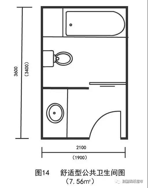 公共衛生間以矩形為佳,因這樣既可少占面寬又可將洗漱與浴廁隔開,使之可供一人洗漱一人浴廁同時使用,增加它的使用功能,使戶型更加“適用”或“舒適”,具體如圖14 所示。該圖尺寸基本上可達到“舒適”標準,若要改成“適用”或“高舒適”標準,可將其開間、進深適當縮小或加大。