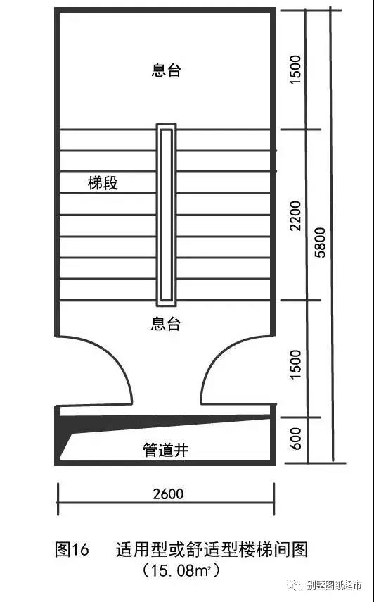 樓梯間的“適用”開間尺寸是2.6m,進深尺寸是5.8m,具體如圖 16 所示。這個尺寸基本能滿足人、家俱搬運、管道井設置等各種要求