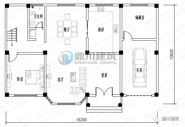 一 層:堂屋、客廳(中空)、臥室、廚房、餐廳、衛生間、儲藏室、車庫
