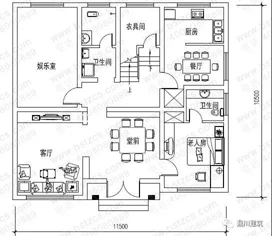 一 層: 堂屋、客廳、老人房(附衛生間)、娛樂室、廚房、餐廳、農具間、衛生間