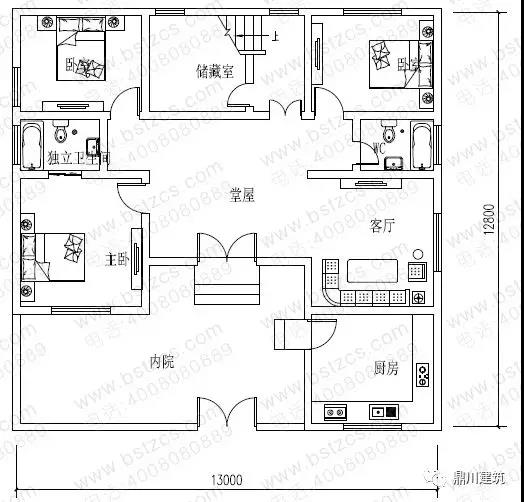 一 層: 內院、堂屋、客廳、臥室(附衛生間)、2臥室、廚房、儲藏室、衛生間