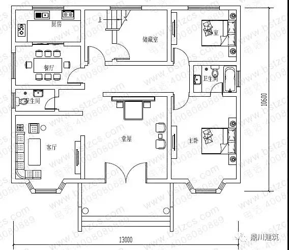 一 層: 堂屋、客廳、主臥(附衛生間)、臥室、廚房、餐廳、儲藏室、衛生間