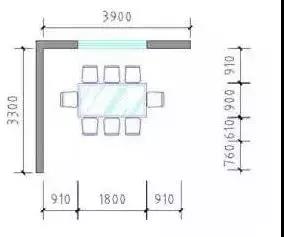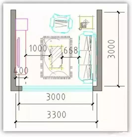 (3)同時需考慮視覺效果,目前市場電視觀看視覺為屏幕對角線3倍,以普通40英寸電視為例,合理視距為3000mm,除去沙發及電視與墻距離,凈開間尺寸在3300mm。