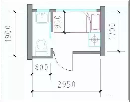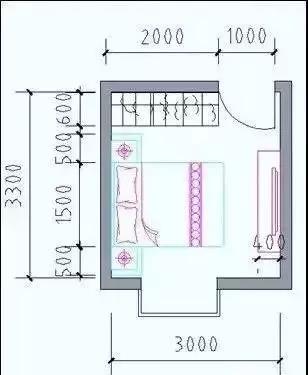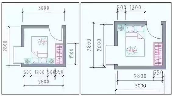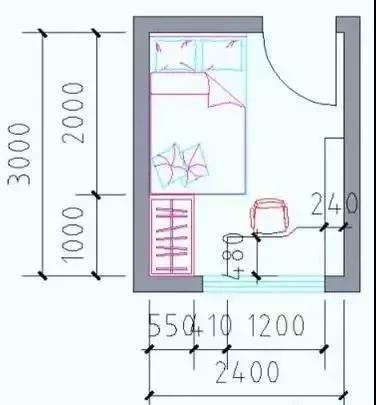 凈寬:床長度2000mm+臥室門1000mm,開間≥3000mm;