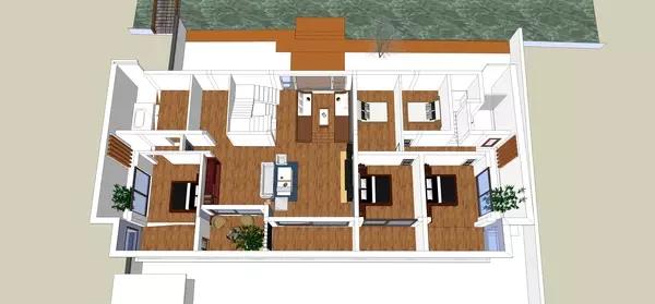 原本設計部分就可以在這里結束了,但老婆提出來說她希望有個閣樓,帶天窗的那種。我考慮了一下,通過對中間 6 米部分屋頂的變形處理,我在屋頂的北側拉出了一個露臺出來。具體布置可以看下面的圖。