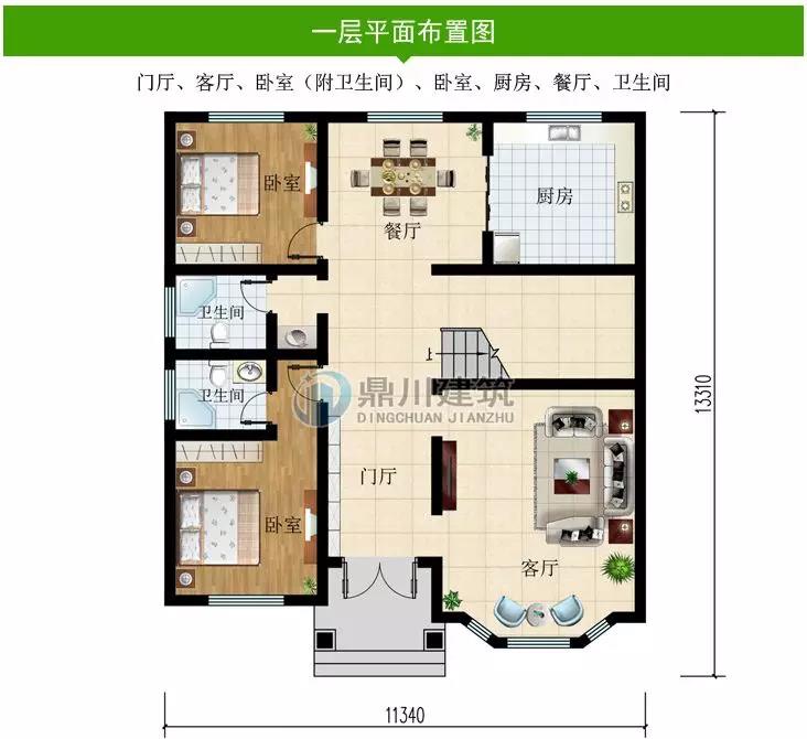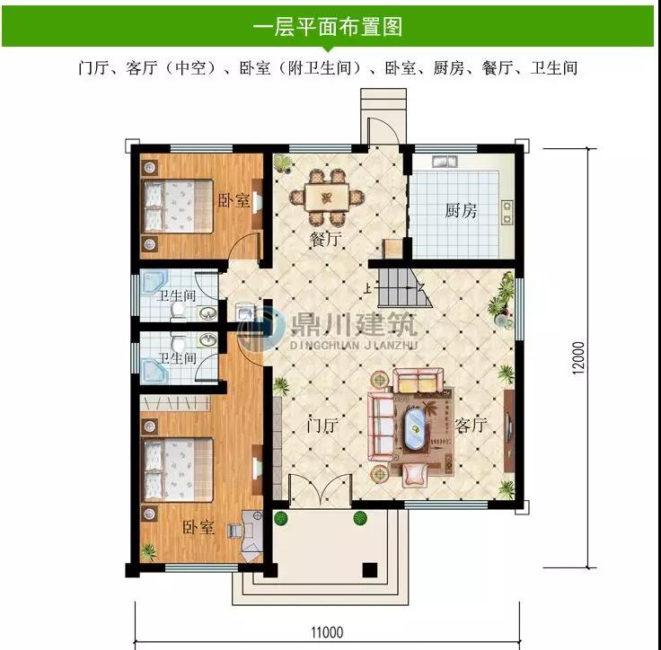 一 層:門廳、客廳、2臥室、廚房、餐廳、衛生間