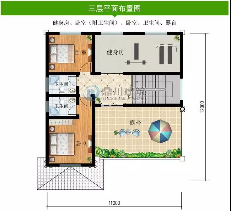 三 層:健身房、臥室(附衛生間)、臥室、衛生間、露臺