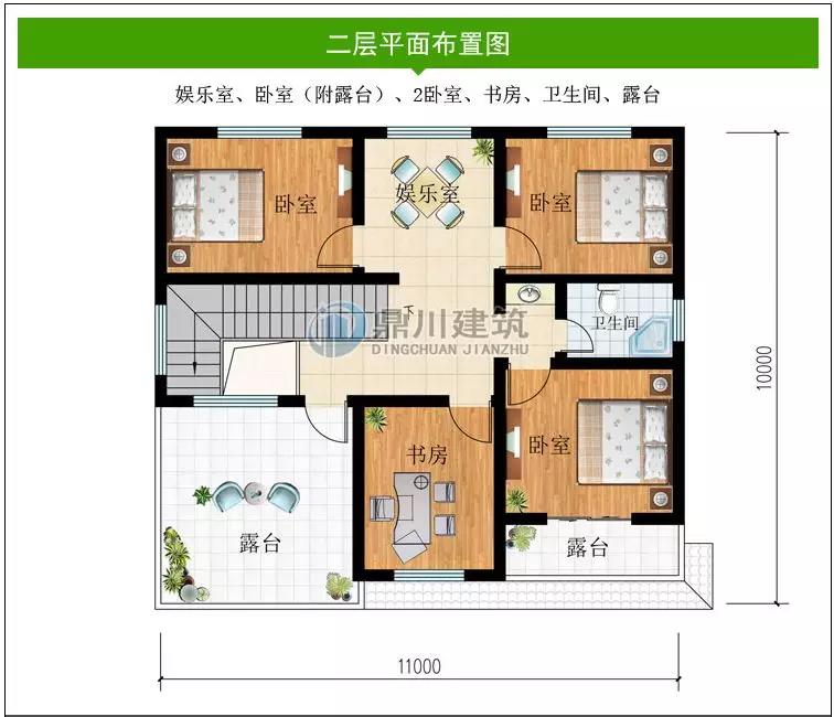 二 層:娛樂室、臥室(附露臺)、2臥室、書房、衛(wèi)生間、露臺
