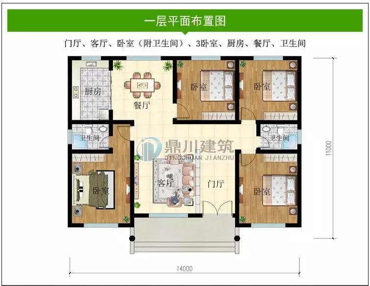 一 層:門廳、客廳、臥室(附衛(wèi)生間)、臥室、廚房、餐廳、衛(wèi)生間