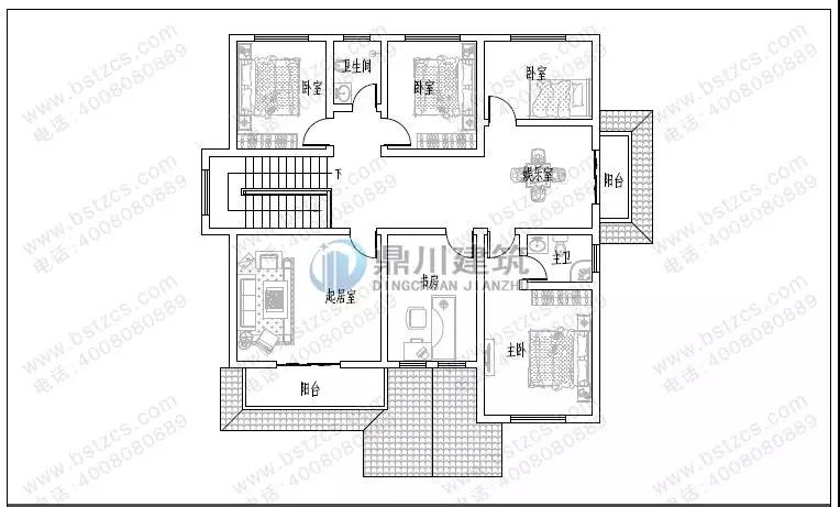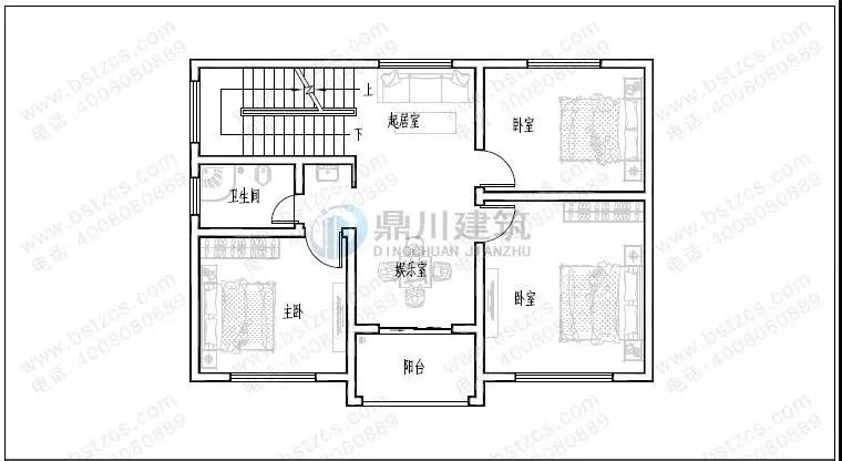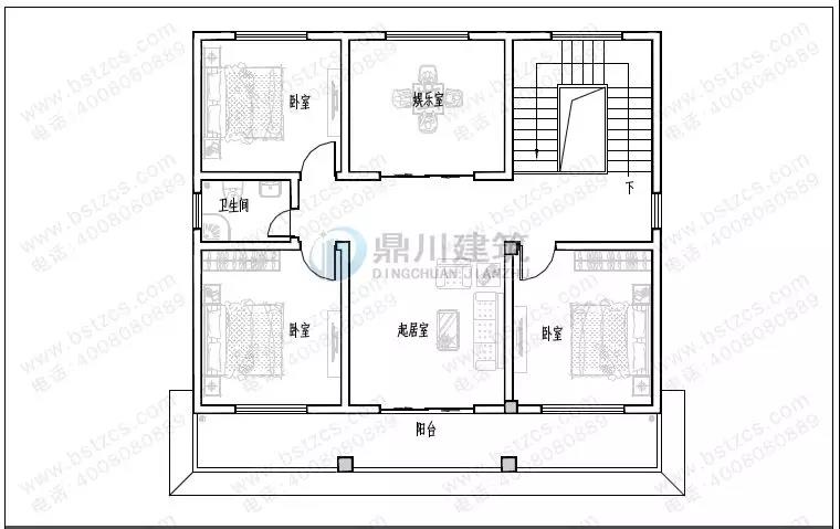 二 層:起居室、娛樂室(附陽臺)、3臥室、衛(wèi)生間