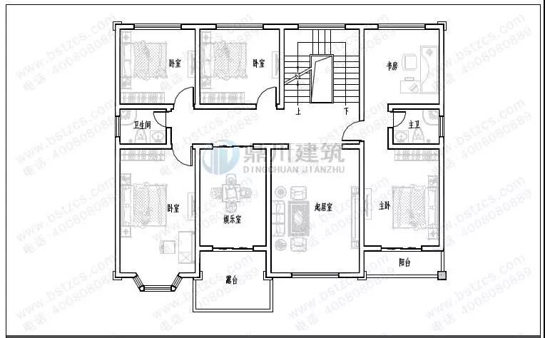 二 層:起居室(附陽臺)、娛樂室(附陽臺)、臥室(附衛(wèi)生間)、3臥室、書房、衛(wèi)生間