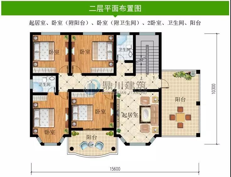 二層設有起居室、臥室(附陽臺)、臥室(附衛生間)、2臥室、衛生間、陽臺。樓上的布局很簡單,臥室占主導位置,臥室大小不一,除了自己,來客人,更有選擇性。一大一小兩個陽臺完全滿足農村對于晾曬的需求。