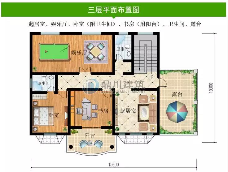 三層設有起居室、娛樂廳、臥室(附衛生間)、書房(附陽臺)、衛生間、露臺。一般現在的年輕小孩都喜歡一個人住在一層樓,有自己的私密空間,所以三樓主臥中帶有衛生間,和書房,是十分合理的,更別說年輕人最喜歡的娛樂廳與露臺了。