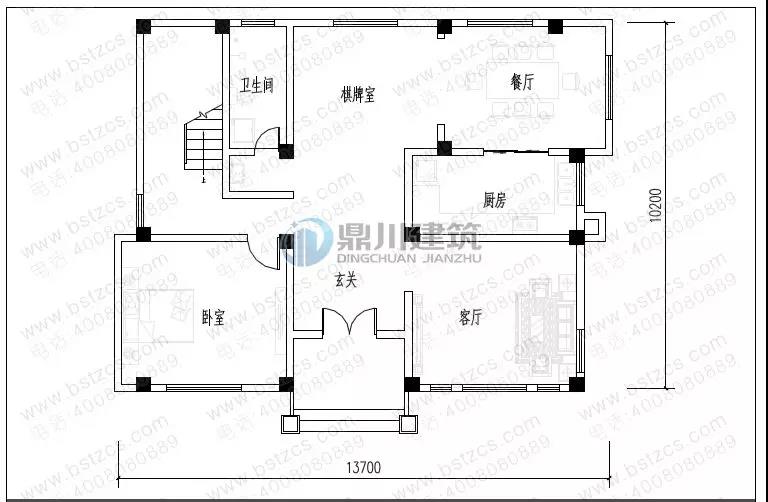 一 層:玄關、客廳、臥室、棋牌室、廚房、餐廳、衛生間