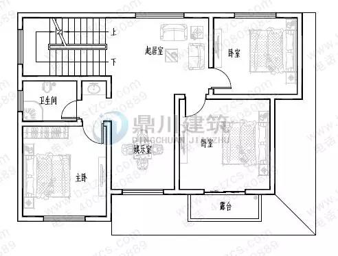 三 層: 活動室、臥室(附衛生間)、臥室(附書房)、衛生間、陽臺、露臺