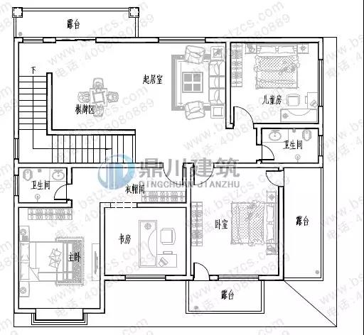 二 層: 小客廳(附陽臺)、臥室(附衛生間,露臺)、臥室(附書房)、臥室、衛生間