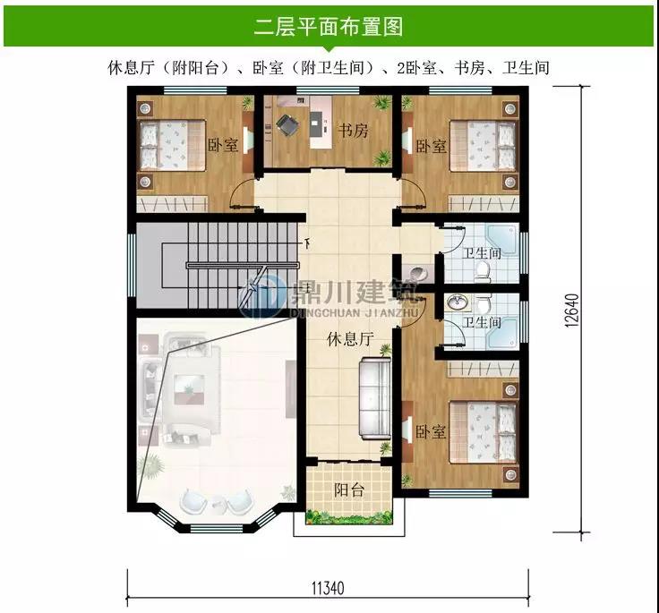 二 層:休息區(qū)(附陽臺)、臥室(附衛(wèi)生間)、2臥室、書房、衛(wèi)生間