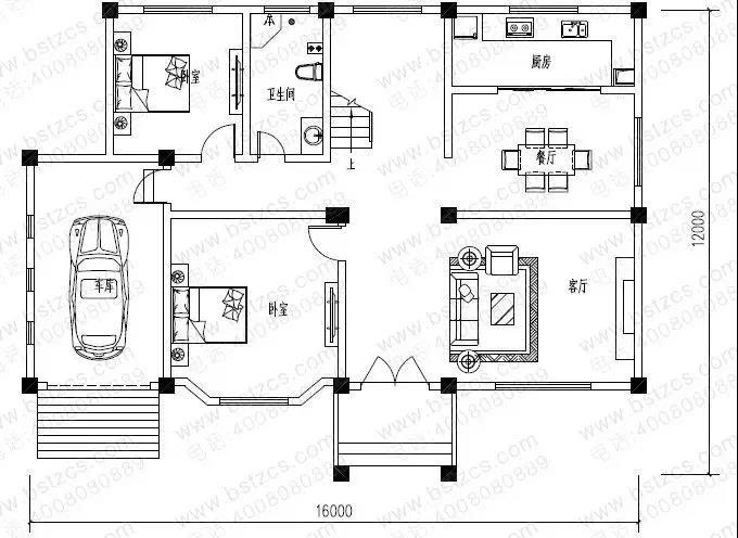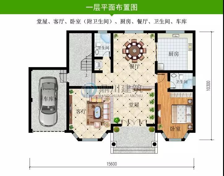一 層:堂屋、客廳、臥室(附衛生間)、廚房、餐廳、衛生間、車庫
