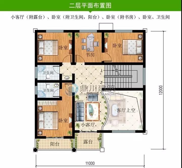 二 層:客廳(附露臺)、臥室(附衛生間,陽臺)、臥室(附書房)、臥室、衛生間
