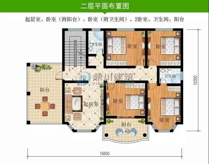 二 層:客廳、臥室(附衛生間)、臥室、兒童房、棋牌室、衛生間、露臺