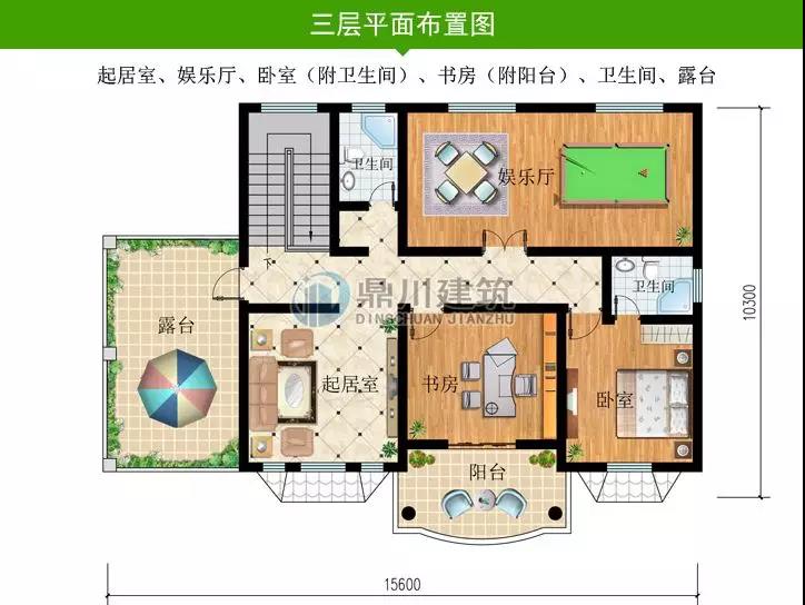 三 層:起居室、娛樂廳、臥室(附衛生間)、書房(附陽臺)、衛生間、露臺