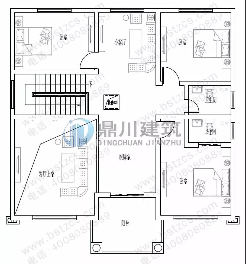 二 層:客廳、棋牌室(附陽臺)、臥室(附衛(wèi)生間)、2臥室、衛(wèi)生間
