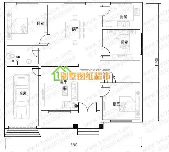 一 層:客廳、3臥室、廚房、餐廳、衛生間、車庫
