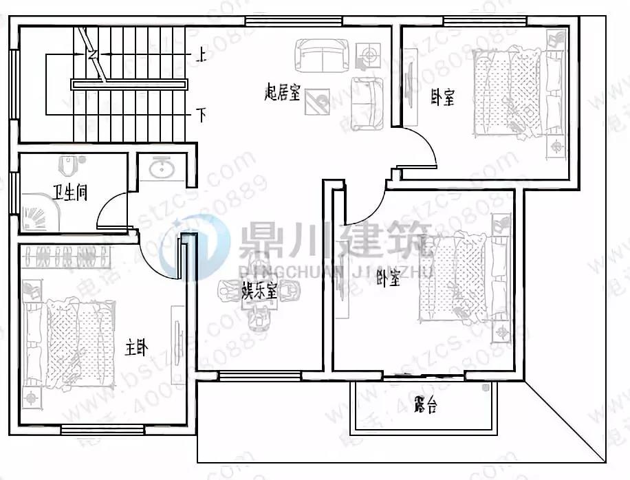 三 層:起居室、娛樂廳、臥室(附衛(wèi)生間)、書房(附陽臺(tái))、衛(wèi)生間、露臺(tái)